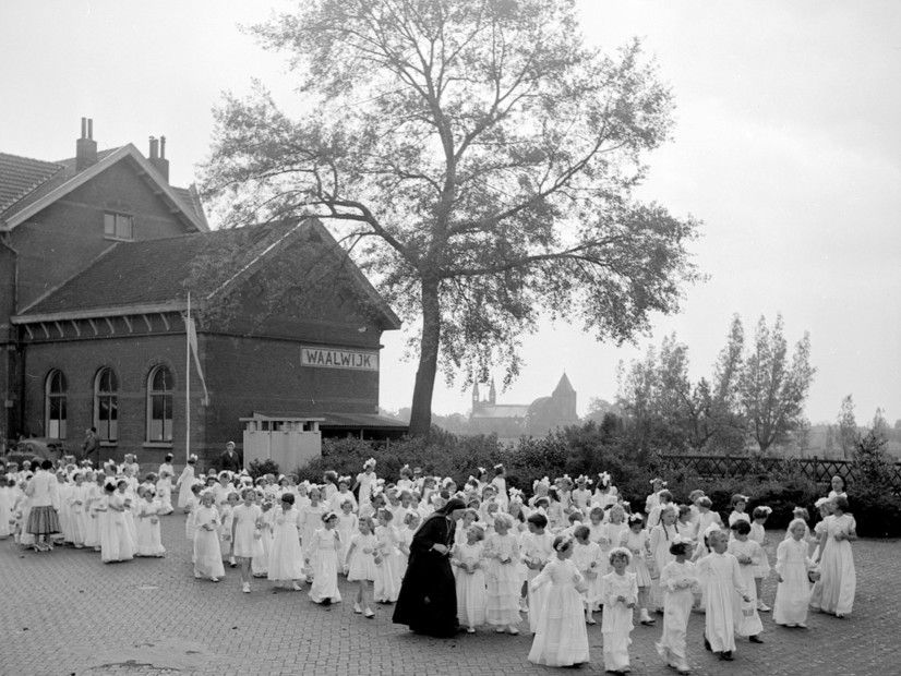 Een groep bruidjes uit de sacramentsprocessie passeert het station aan de Burg.v.d.Klokkenlaan, op de achtergrond de St. Antoniuskerk aan de St. Antoniusstraat (Collectie SALHA, foto J. de Bont)