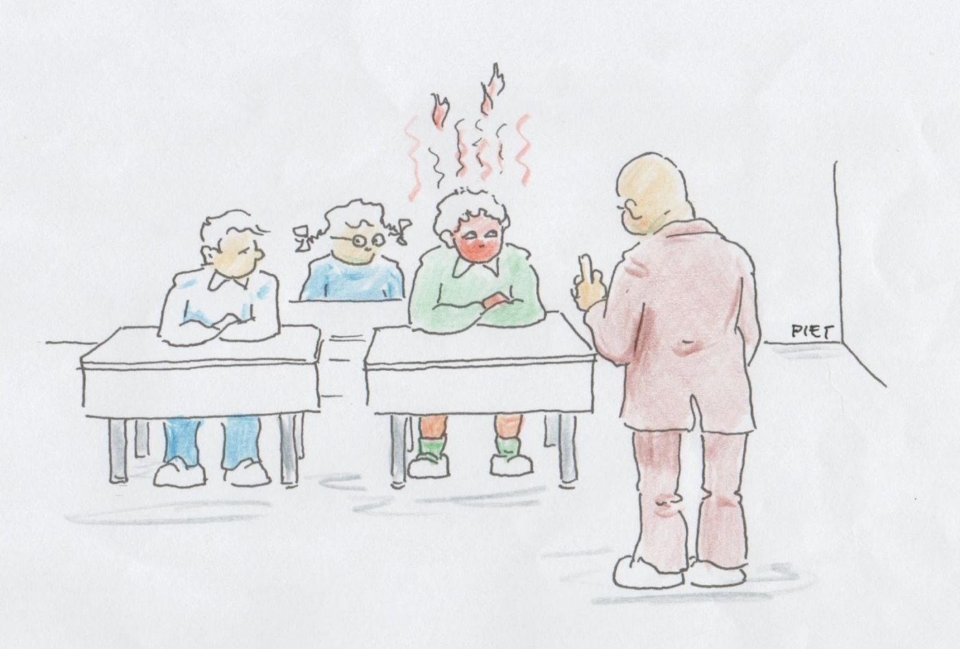 In m’ne laogereschooltijd deeje we pepièrkes schiéte nòr mekaore. We vùrmde dan meej duim en wijsvinger ‘ne mik zo es bij ‘ne kattepult, en meej ‘n illestiekske – floep! – vloog ‘t pepièrke zoo dur de klas. Stiekem, es de mister efkes nie keek, dan deeje we dè. Ge kon daor best ver meej schiéte. Dè waar Jantjes aorig goéd gelukt: hij schoot ‘t rèècht bij de miste op de lessenèèr. Hij zaat hillemaol aachter in de klas meej z’n verschoote truiken aon. De mister zeej: “Wie heeft dat gedaan?” Nou, dè waar nie zo moejlijk. Hij verraojde z’n èège: ge zaagt ‘m verschiéte.